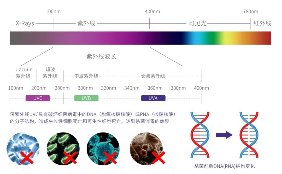 LED UVC深紫外通过破坏微生物细胞的DNA(脱氧核糖核酸)和RNA(核糖核酸)的分子结构,造成生长性细胞和(或)再生性细胞死亡,达到除菌消毒的效果。
