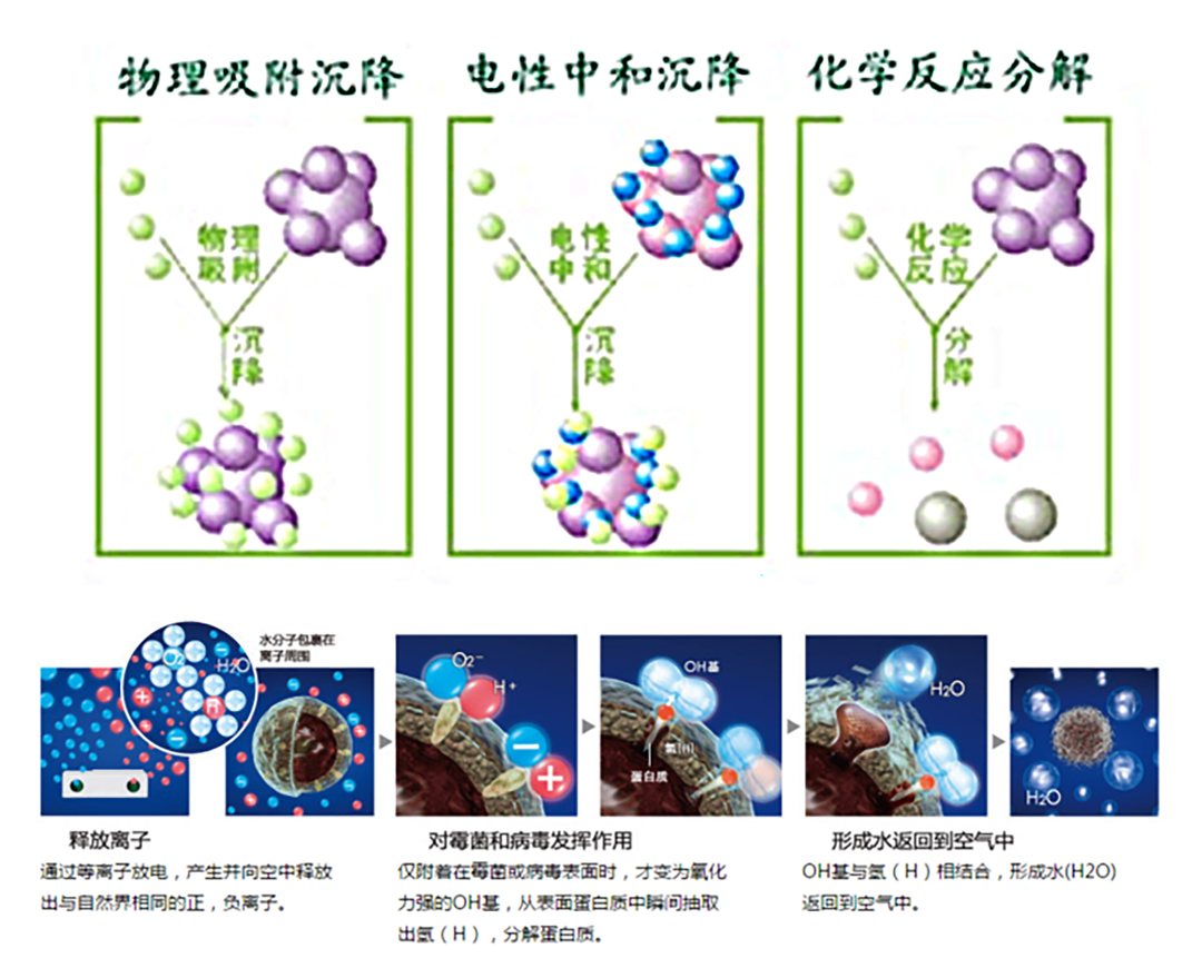 负离子能使空气中肉眼看不见的(粒径小至0.01微米)颗粒以及漂尘、异味分子,通过正、负离子间相互吸引、碰撞、中和,而形成中性分子团,下沉落地,达到降尘、除异味、净化的效果。