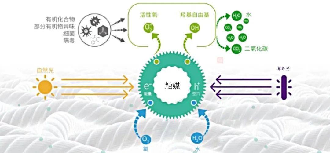 主要原理包含银离子与细菌内之硫氢根进行反应达到抑制其繁衍之目的,与触媒(必须经由UV光照射激发,触媒反应速度和活性激发效果所需要之UV波段,UVCUVBUVA)产生超氧自由基进行细菌分解,奈米材料表面带有电荷,此电荷会拉扯细菌的细胞膜,而造成细胞膜破裂导至细菌死亡。