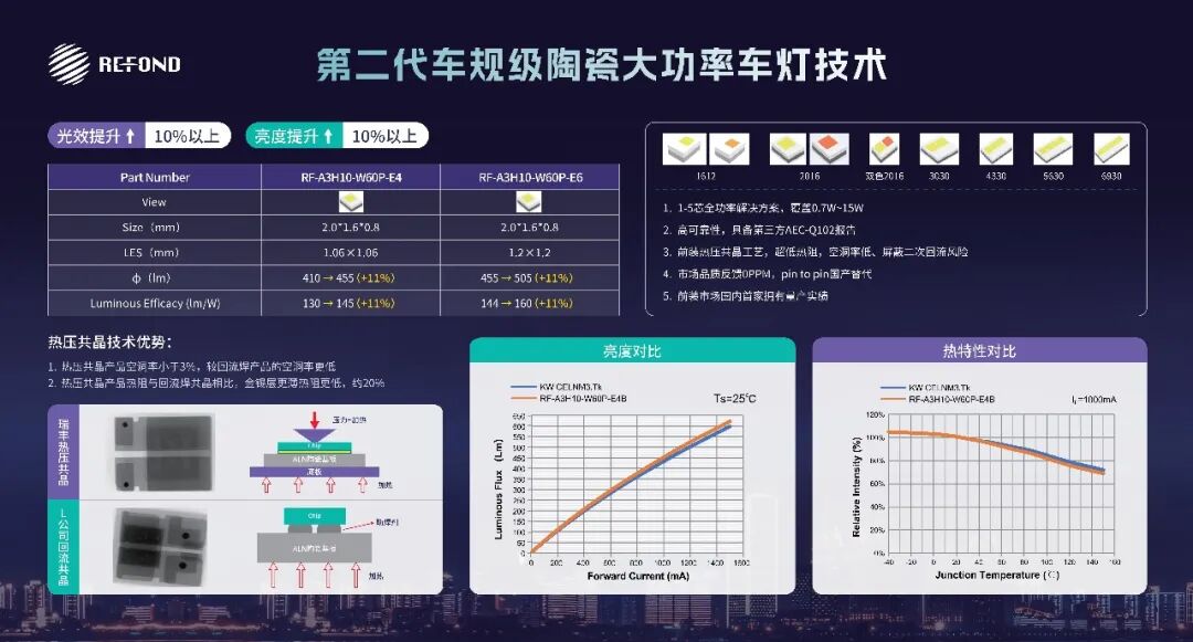 针对车用外饰大功率照明需求,瑞丰光电将展出最新迭代的第二代车规级陶瓷大功率车灯技术及金刚石基超大功率密度封装产品,为汽车大灯提供高品质、高光效、高可靠性LED光源的产品解决方案。