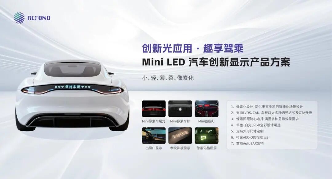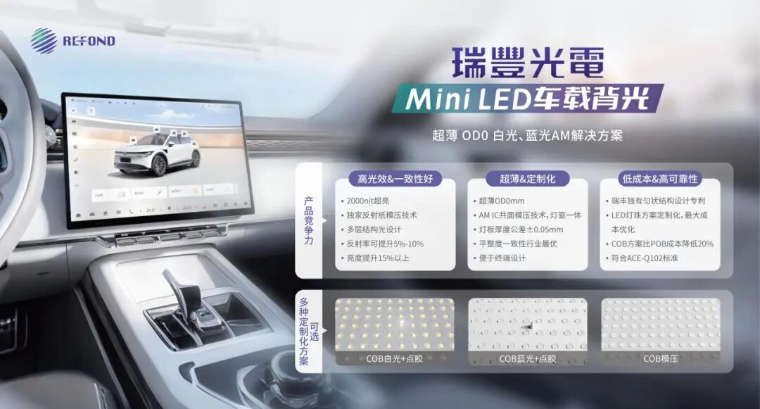 在车载显示方面,瑞丰光电将带来超薄OD0白光、蓝光AM解决方案,为车载显示带来极致视觉体验;同时基于 Mini LED 直显技术“小、轻、薄、柔、像素化”的特性,瑞丰光电将带来覆盖车内外场景的Mini LED汽车创新显示产品方案,赋予汽车更多个性化表达。