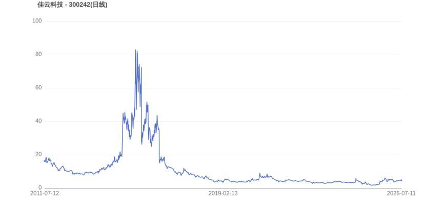 从上市首日至今,佳云科技的市值实现了1.45倍的增长。2015年12月17日,佳云科技的市值巅峰达到163.49亿元,股价也顺应升至51.53元。而至7月11日收盘,佳云科技的股价为4.7元,市值为29.82亿元,相比峰值时期市值减少133.67亿元,市值蒸发了81.76%。