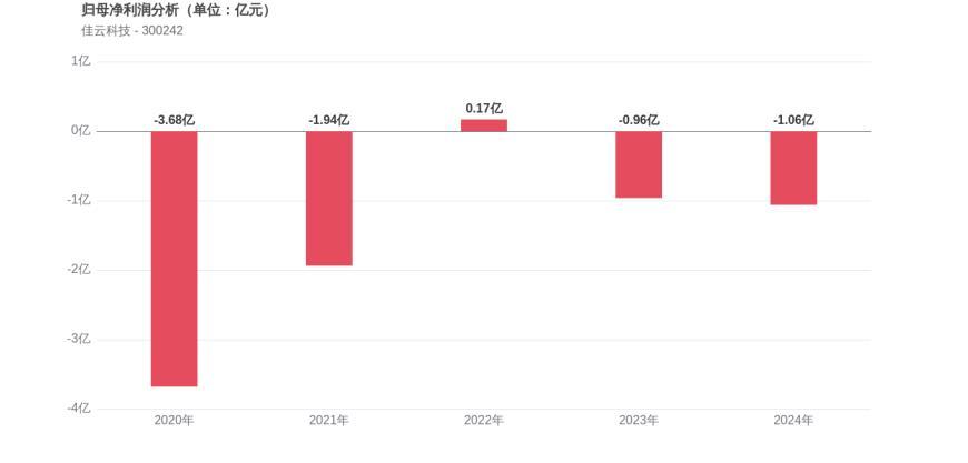 利润角度分析,2020年佳云科技实现归母净利润-3.68亿元,2024年-1.06亿元。亏损幅度有所收窄,但仍未实现扭亏为盈。