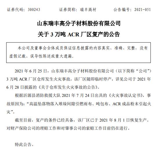 8月2日消息,瑞丰高材(300243)(300243)3 万吨 ACR 厂区恢复生产,1个月多前因发生火灾停产。