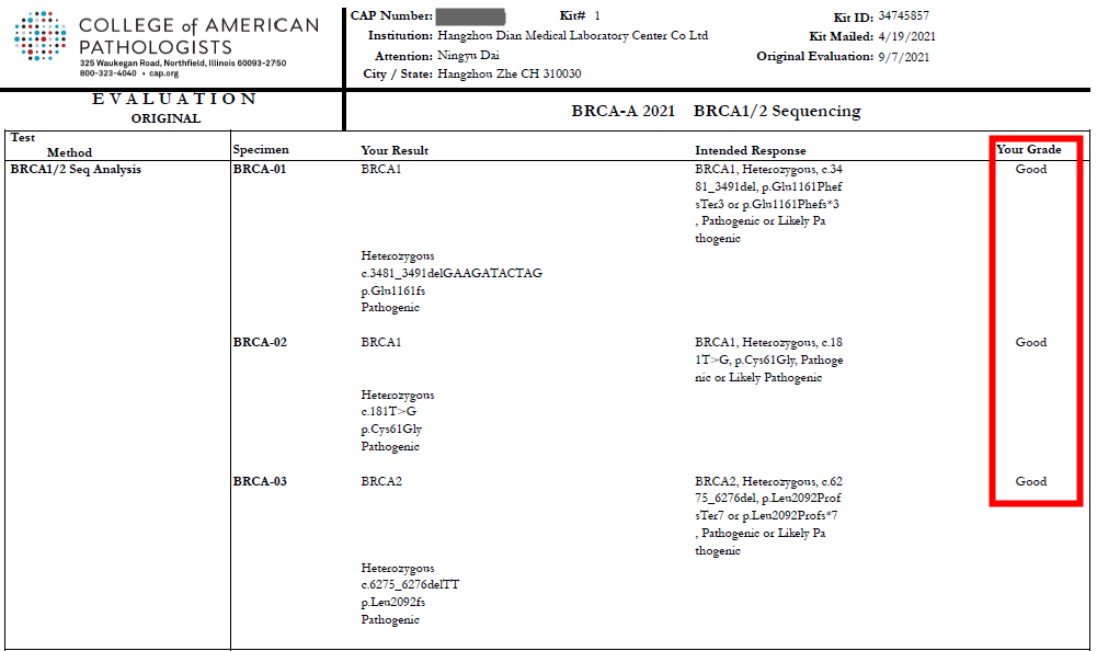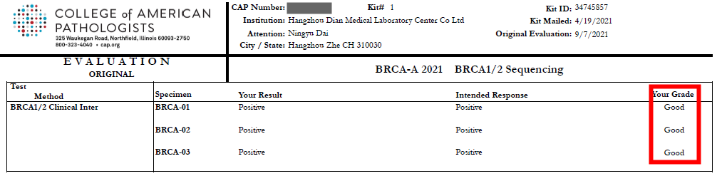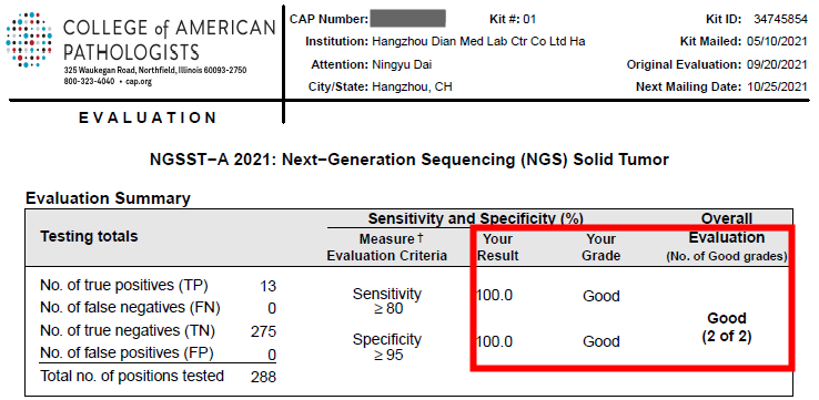 美国病理学会(CAP)是全球公认的国际医学实验室标准体系,其能力验证项目是世界上开展项目最多,涵盖范围最广的医学实验室能力验证项目,可以帮助实验室定期评估检测项目的能力,并提升病人检测结果的准确性。本次两项满分通过CAP室间质评,证明了迪安诊断NGS中心在BRCA1/2基因和实体肿瘤突变高通量测序检测能力和生信分析能力。
