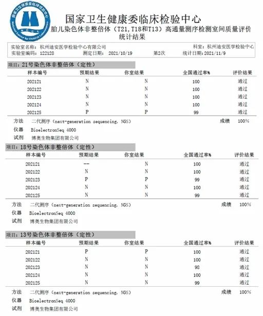 11月9日,国家卫生健康委临床检验中心(NCCL)公布了《2021年全国外周血胎儿染色体非整倍体(T21、T18和T13)高通量测序第二次室间质量评价》结果,迪安诊断NGS中心再次以100分的优异成绩通过。