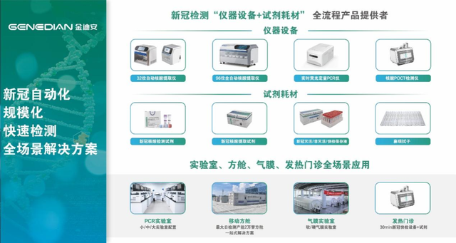 迪安生物的新冠核酸检测整体解决方案,涵盖新冠核酸检测过程中各种病毒采集保存管、口鼻拭子,全自动核酸提取设备和磁珠试剂,实时荧光定量PCR仪和新冠核酸检测试剂,方舱实验室和气膜实验室等全流程配套产品,真正实现新冠检测自动化、规模化全场景解决方案。