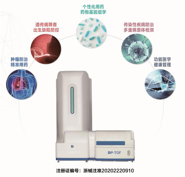 DP-TOF飞行时间核酸质谱仪是国内首款获批的通用型核酸质谱仪,准确、经济、简单、便捷、灵活的中通量基因检测平台,获国内首台(套)重大技术装备认定&浙江省工业新产品鉴定。DP-TOF整合了PCR技术的高灵敏度、芯片技术的高通量、质谱技术的高精确度和计算机智能分析的强大功能,基于基质辅助激光解析电离飞行时间质谱(MALDI-TOF MS)技术,与配套试剂用于对生命体来源(如血液、体液、组织)样本中已知核苷酸的检测。