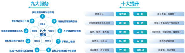 迪安诊断合作共建是整合迪安“产品+服务”的特色优势,向不同类型客户提供医学实验室综合服务的一种商业模式。基于“迪智”九大服务,为客户提供具有迪安特色的“服务产品集方案及运营”组合拳服务,以满足客户在技术、质量、管理方面的不同需求,进而实现医院实验室诊断技术水平和质量管理水平的提升,降低运营成本,提高实验室运营效率的有效提升。