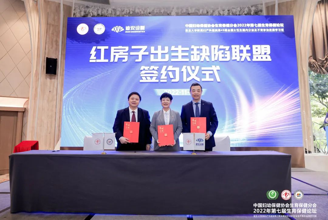 复旦大学附属妇产科医院院长徐丛剑教授(左)、复旦大学生殖与发育研究院院长黄荷凤院士(中)和迪安诊断董事长陈海斌(右)签约。