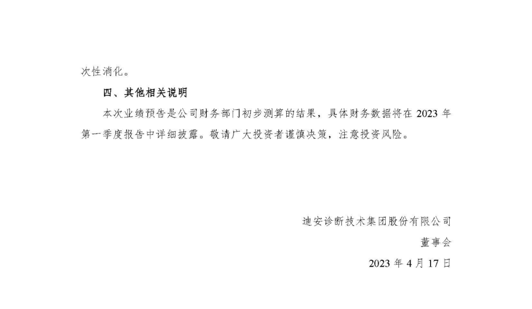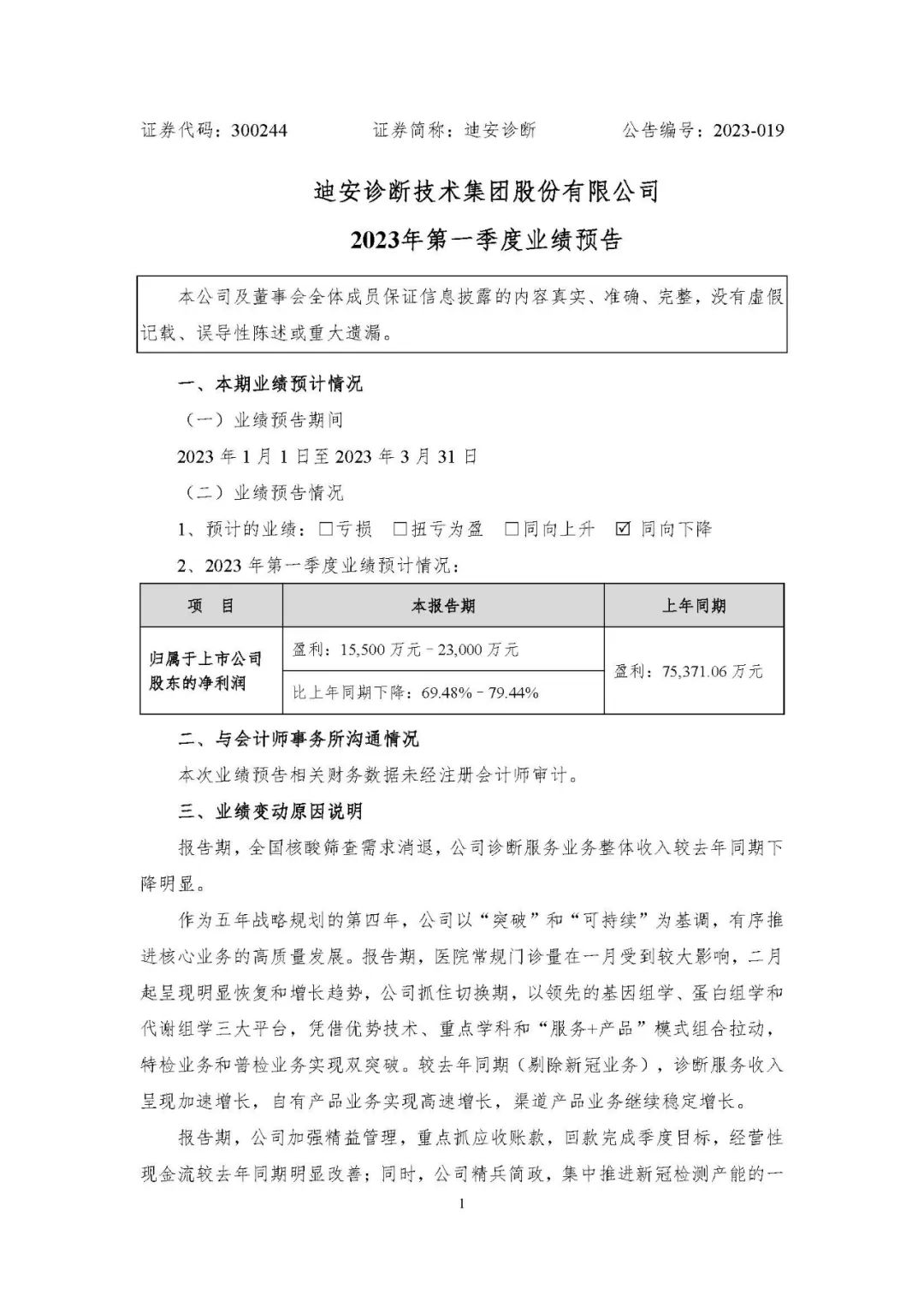 4月17日,A股上市公司迪安诊断发布一季度业绩预告,公司预计2023年1-3月业绩大幅下降,归属于上市公司股东的净利润为1.55亿-2.30亿,净利润同比下降79.44%至69.48%。