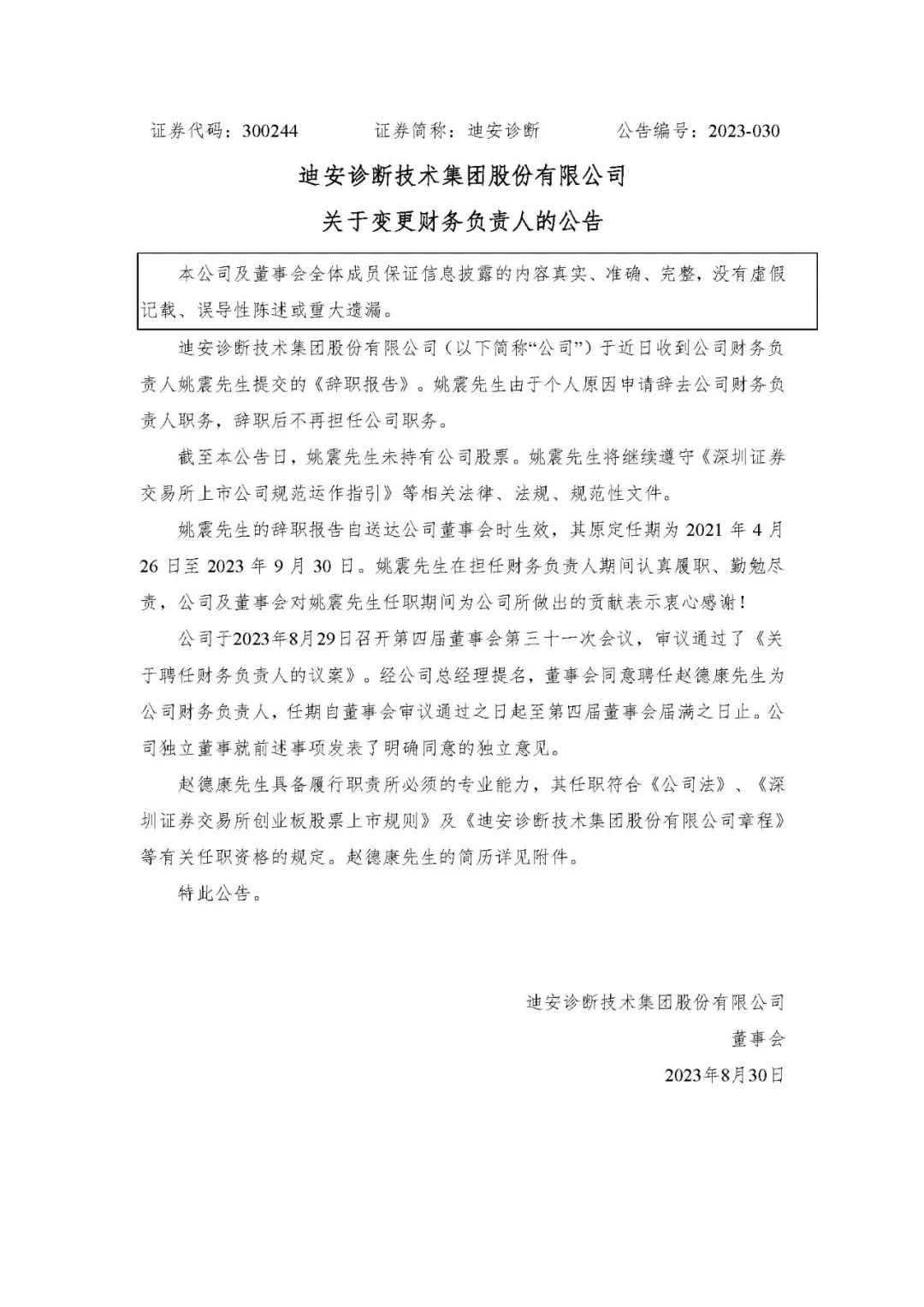 迪安诊断公告,公司于近日收到公司财务负责人姚震先生提交的《辞职报告》。姚震先生由于个人原因申请辞去公司财务负责人职务,辞职后不再担任公司职务。