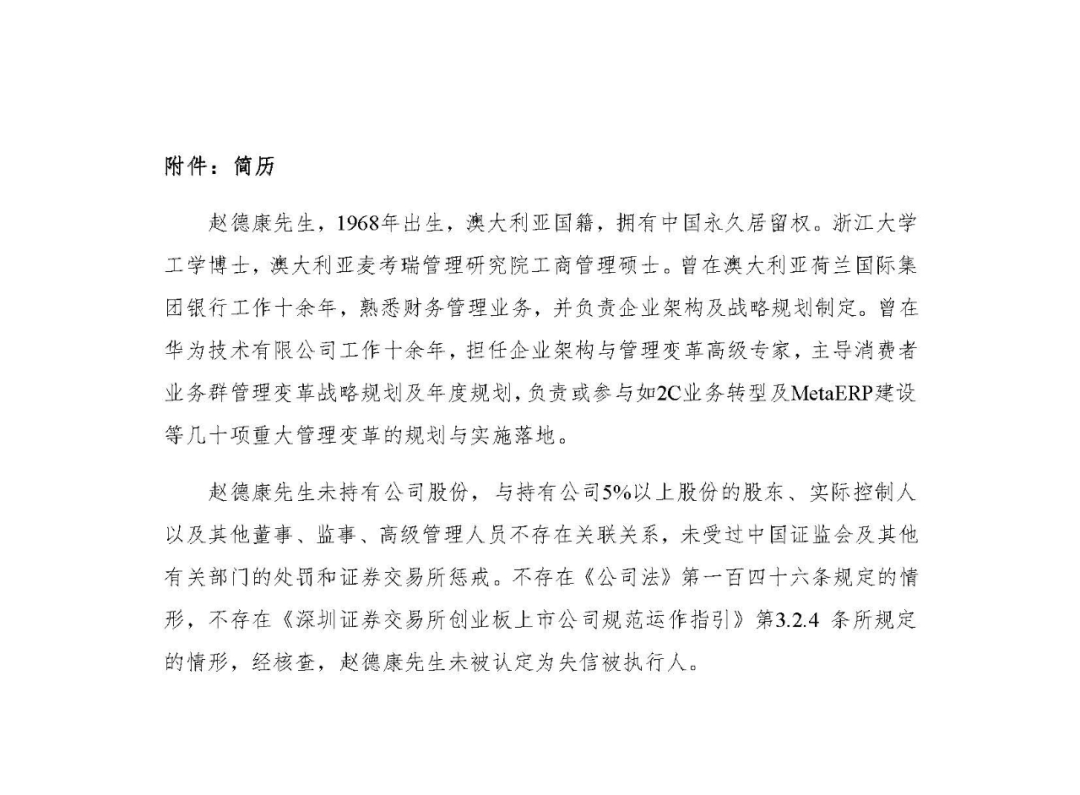 赵德康先生,1968年出生,澳大利亚国籍,拥有中国永久居留权。浙江大学工学博士,澳大利亚麦考瑞管理研究院工商管理硕士。曾在澳大利亚荷兰国际集团银行工作十余年,熟悉财务管理业务,并负责企业架构及战略规划制定。曾在华为技术有限公司工作十余年,担任企业架构与管理变革高级专家,主导消费者业务群管理变革战略规划及年度规划,负责或参与如2C业务转型及MetaERP建设等几十项重大管理变革的规划与实施落地。