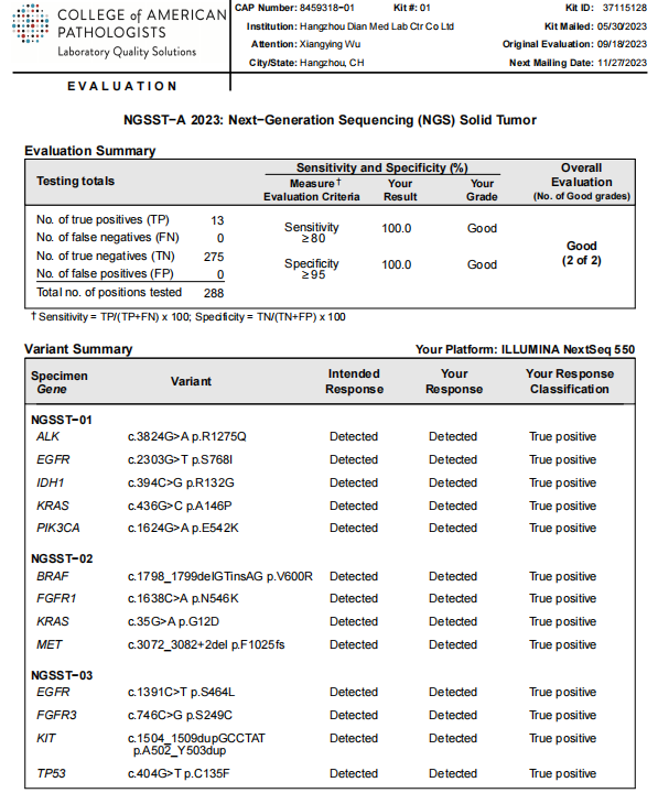 迪安诊断临床基因组中心以自主研发的实体瘤检测项目参加本次活动,在敏感性和特异性中均达到100%,变异结果与CAP结果完全一致,最终满分通过。