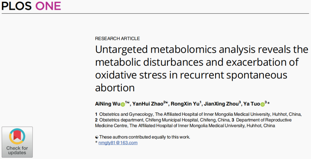 论文标题:《Untargeted metabolomics analysis reveals the metabolic disturbances and exacerbation of oxidative stress in recurrent spontaneous abortion》