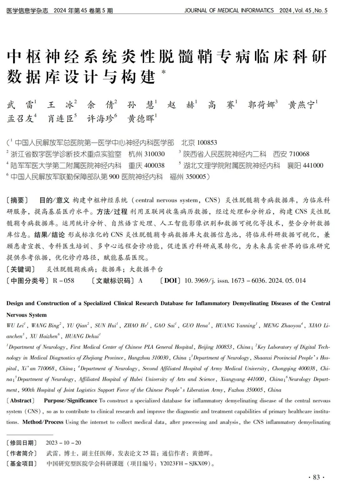 作为中国人群中首个基于AI技术的CNS炎性脱髓鞘疾病数据库平台(x-MedFinder CNS Database),其为此类罕见病的临床队列构建、管理及深入研究提供了坚实的数据基础。近日,该平台相关研究成果发表于国内核心期刊《医学信息学杂志》(ISSN 1673-6036)。