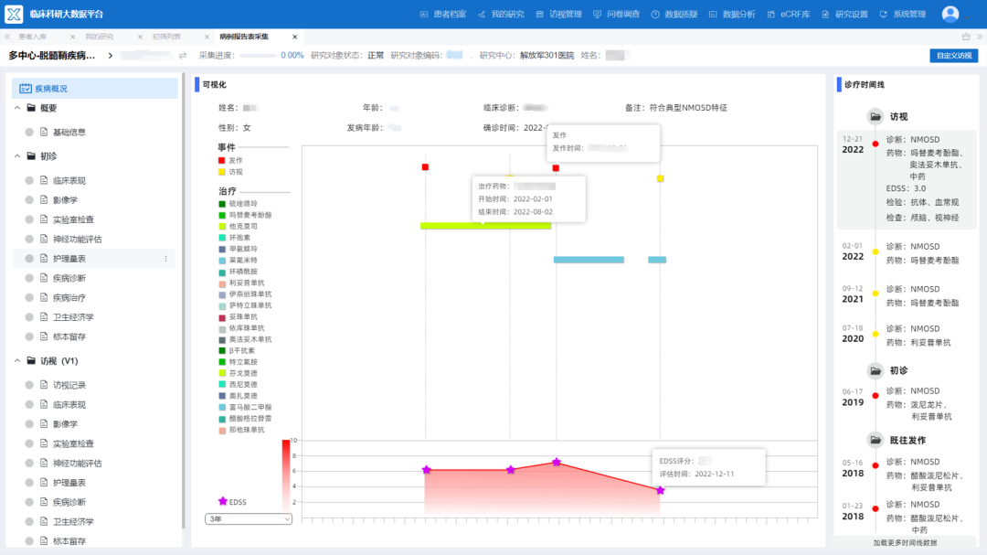 聚焦临床需求,迪安诊断与中国人民解放军总医院第一医学中心神经内科医学部团队紧密协作,在中国研究型医院学会科研课题的支持下,历时一年多,开发了CNS炎性脱髓鞘专病临床科研数据库,并于2022年正式应用于临床。