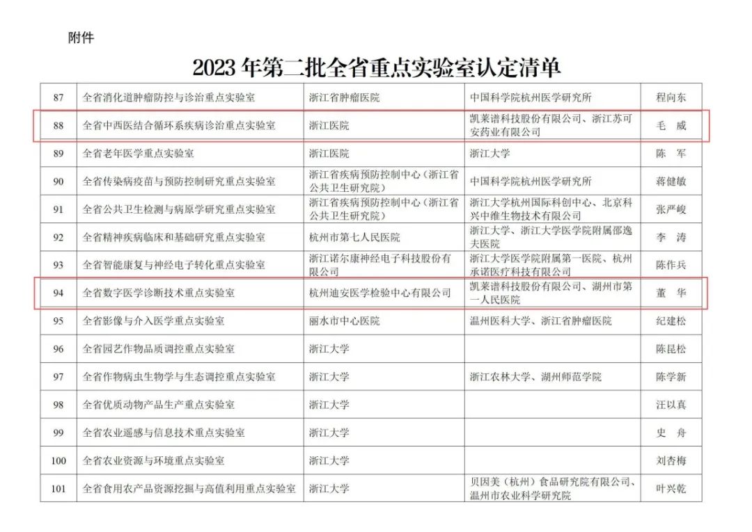 杭州迪安医学检验中心有限公司作为依托单位的“全省数字医学诊断技术重点实验室”,迪安诊断作为共建单位的“全省肿瘤分子诊断与个体化治疗研究重点实验室”,以及凯莱谱科技股份有限公司作为共建单位的“全省中西医结合循环系疾病诊治重点实验室”被认定为全省重点实验室。