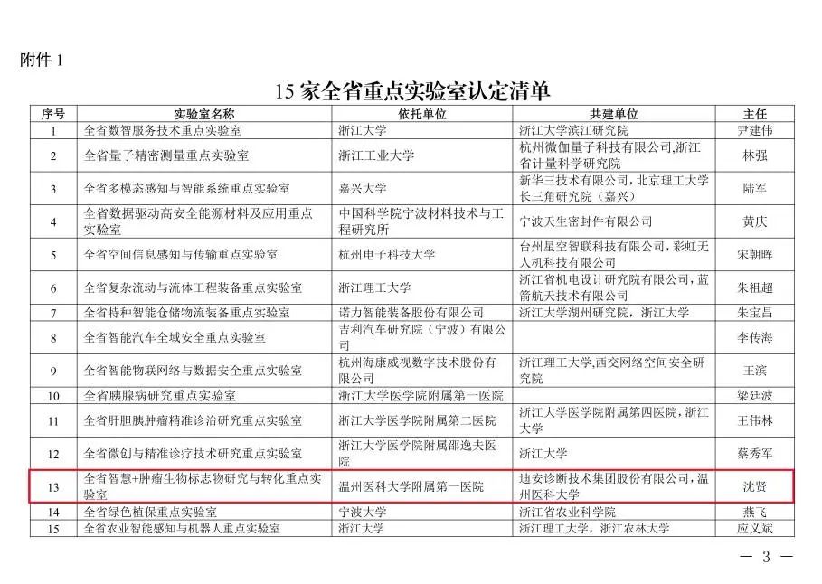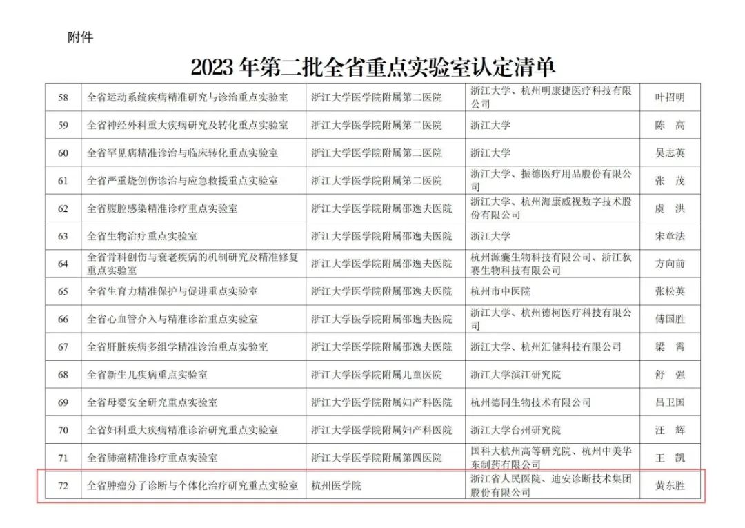 此外,2024年2月,迪安诊断作为共建单位的“全省智慧+肿瘤生物标志物研究与转化重点实验室”,已位列浙江省科学技术厅公布的2023年全省重点实验室首批“15家全省重点实验室认定清单”。