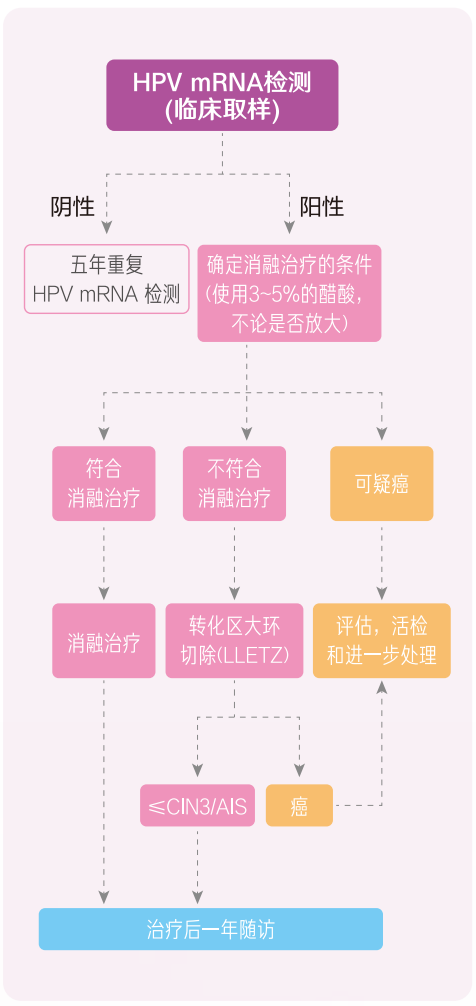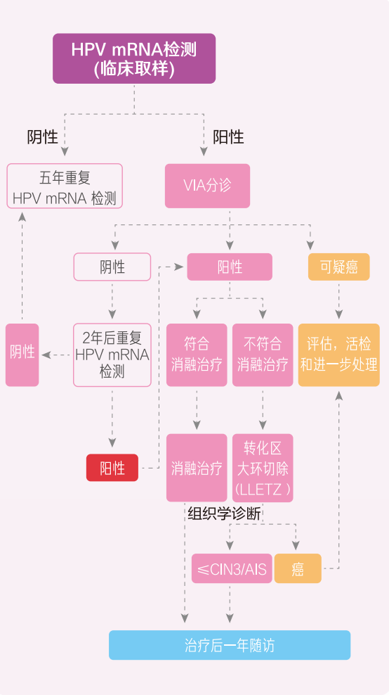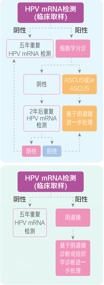 世界卫生组织(WHO)和联合国人类生殖特别规划处(HRP)于2021年7月6日发布的最新《宫颈癌前病变筛查和治疗指南》推荐HPV-DNA检测作为宫颈癌筛查的首选筛查方法。2021年12月指南更新HPV mRNA的检测建议:推荐HPV mRNA检测可与HPV DNA同样用于宫颈癌初级筛查,并同步更新了关于筛查频率及相关处理等管理规范。