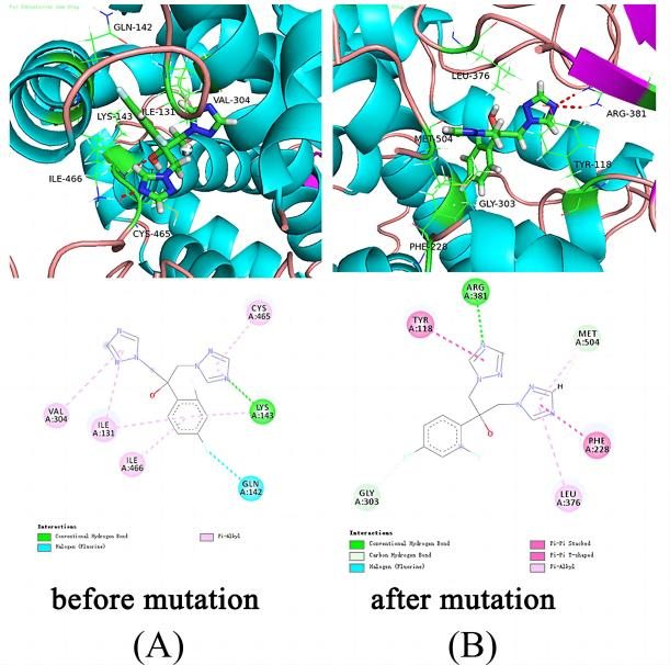 突变前后氟康唑与ERG11的相互作用模式