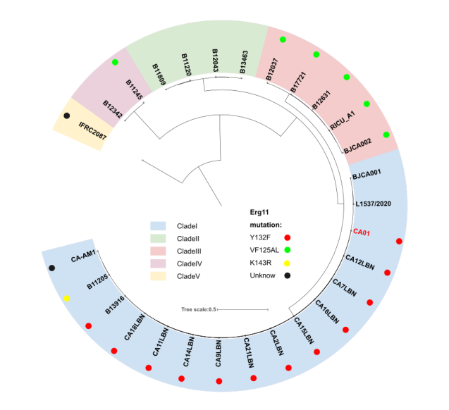 研究揭示,CA01株属于南亚分支,并且与之前文献中报道的北京地区首次发现的耳念珠菌BJCA001和BJCA002展现出紧密的遗传联系。相较于中国本土记录的唯一同属南亚分支的BJCA001菌株,CA01对抗真菌药物氟康唑表现出了明显的耐药性,究其原因在于ERG11基因发生了A395T突变。