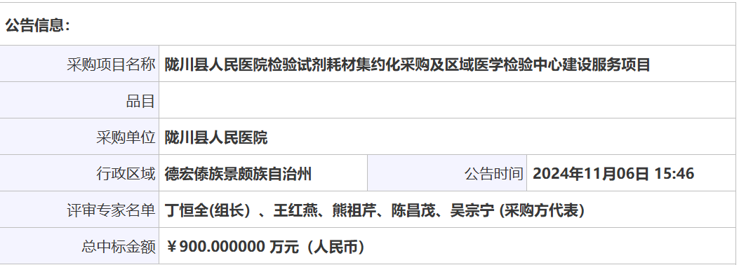 11月6日,中国政府采购网发布陇川县人民医院检验试剂耗材集约化采购及区域医学检验中心建设服务项目中标公告,迪安诊断旗下企业云南盛时迪安生物科技有限公司中标此项目,中标金额为900万元。