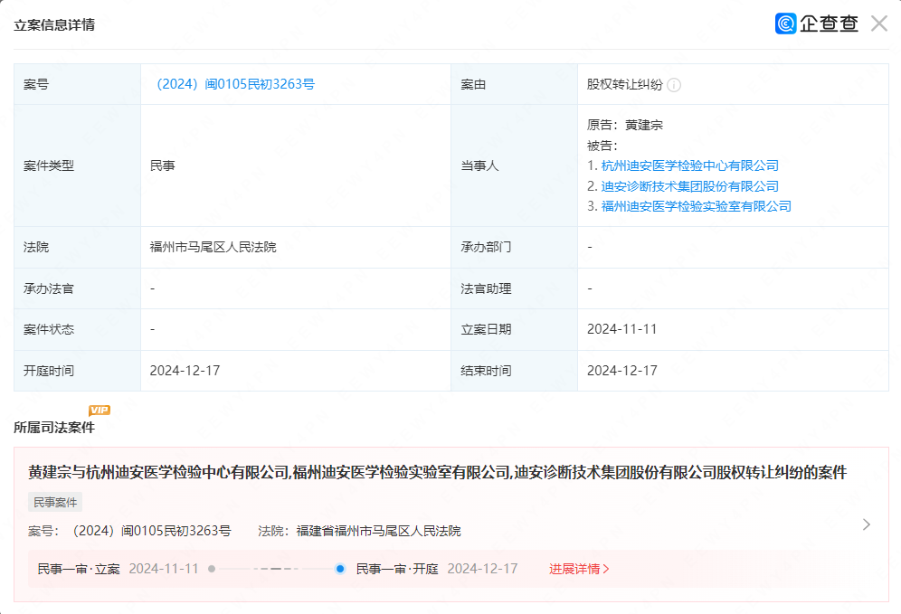 近日,据企查查数据显示,迪安诊断福建子公司旗下被投企业股东黄建宗因股权纠纷起诉杭州迪安医学检验中心有限公司、迪安诊断技术集团股份有限公司和福州迪安医学检验实验室有限公司。