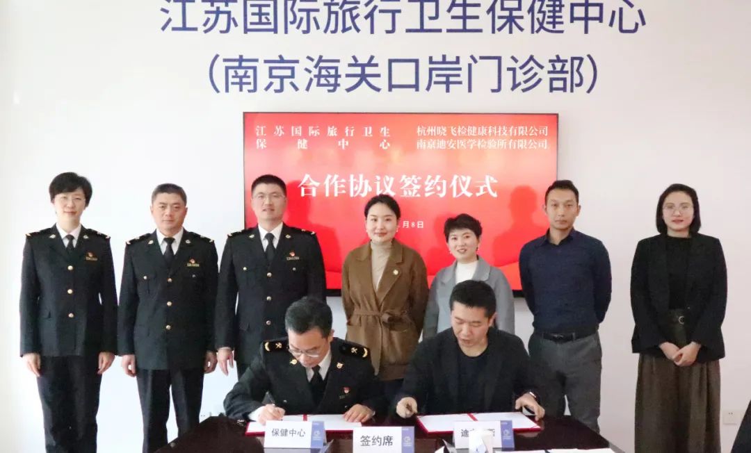 1月8日,迪安诊断旗下晓飞检、南京迪安与江苏国际旅行卫生保健中心(南京海关口岸门诊部)正式签署合作协议,双方将在医学诊断和健康管理领域展开深度合作。这是迪安诊断在江苏省启动的首个“体检共建”项目,标志着传统合作模式的深化与创新,是推动健康管理事业发展的重要一步。