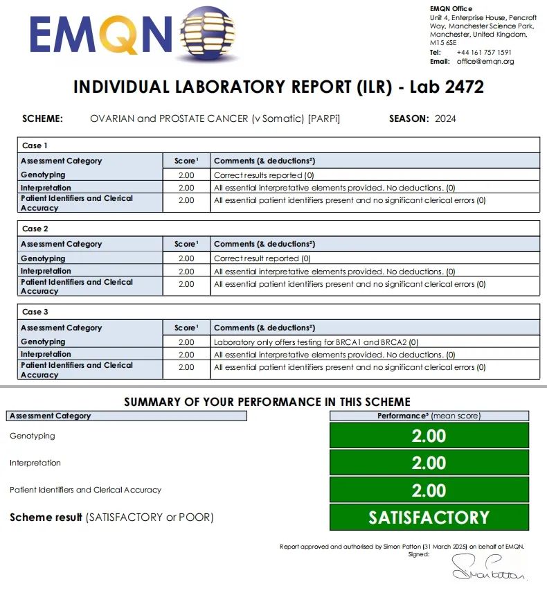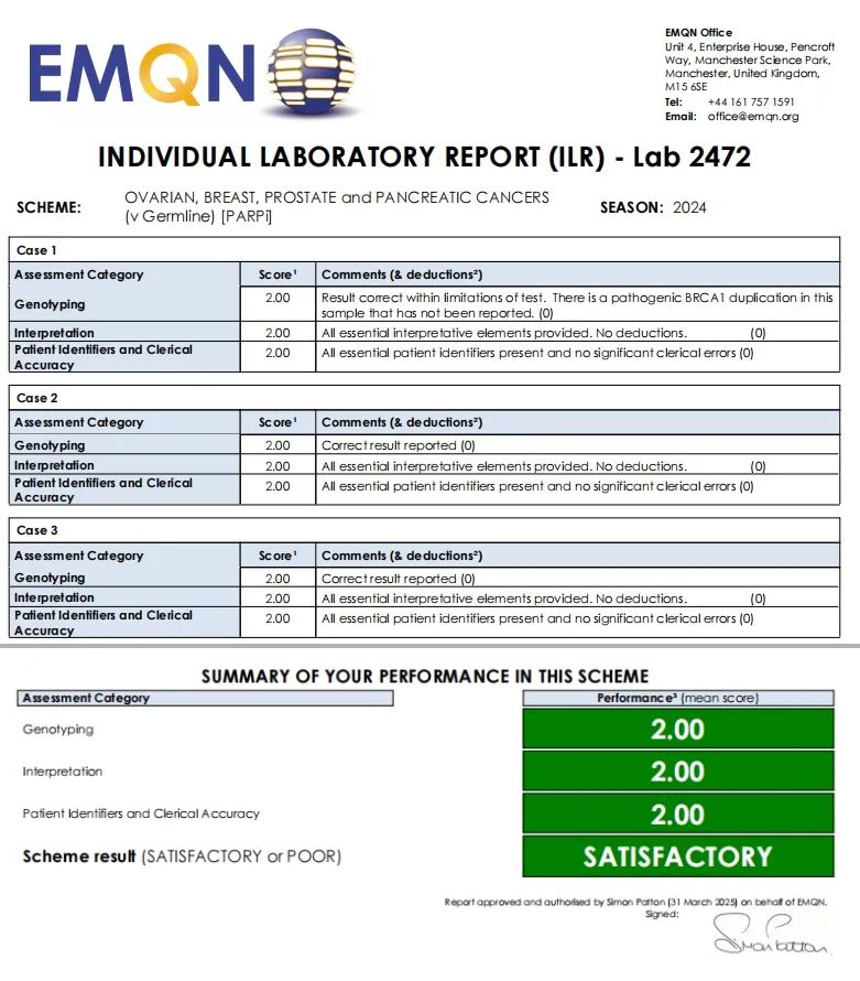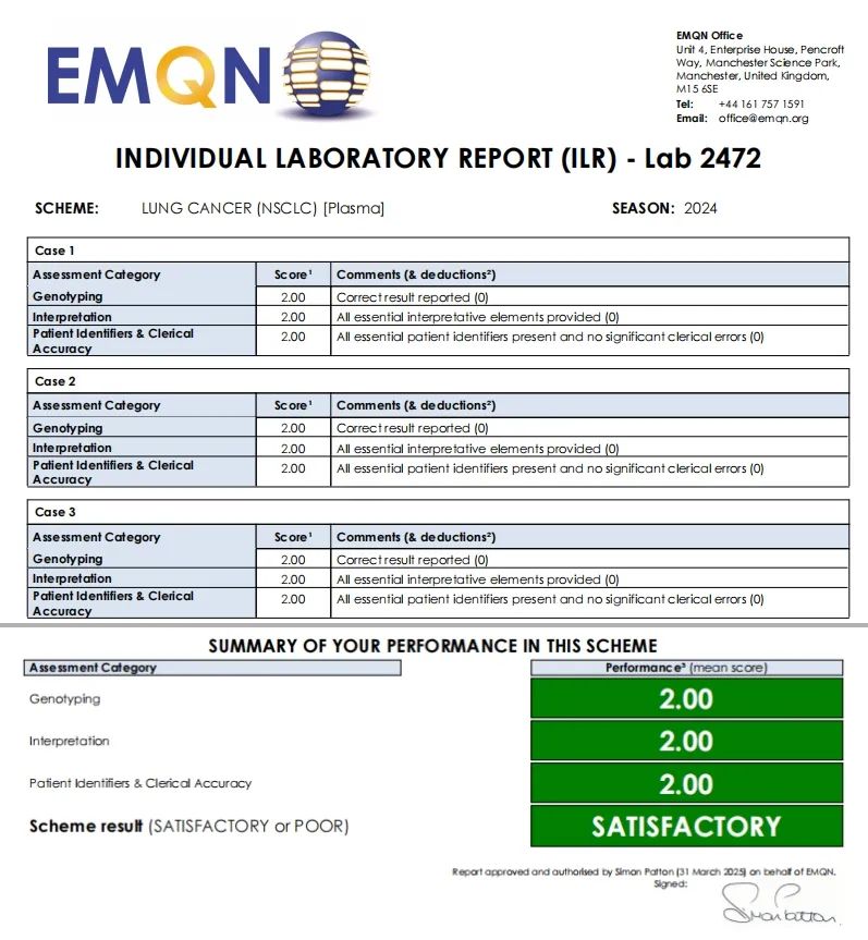 EMQN是国际权威室间质评检测机构,其考核结果反映实验室技术的准确性、质量管理的规范性以及检测服务的专业性,是全球分子遗传学临床实验室最高水平的认证标准之一。