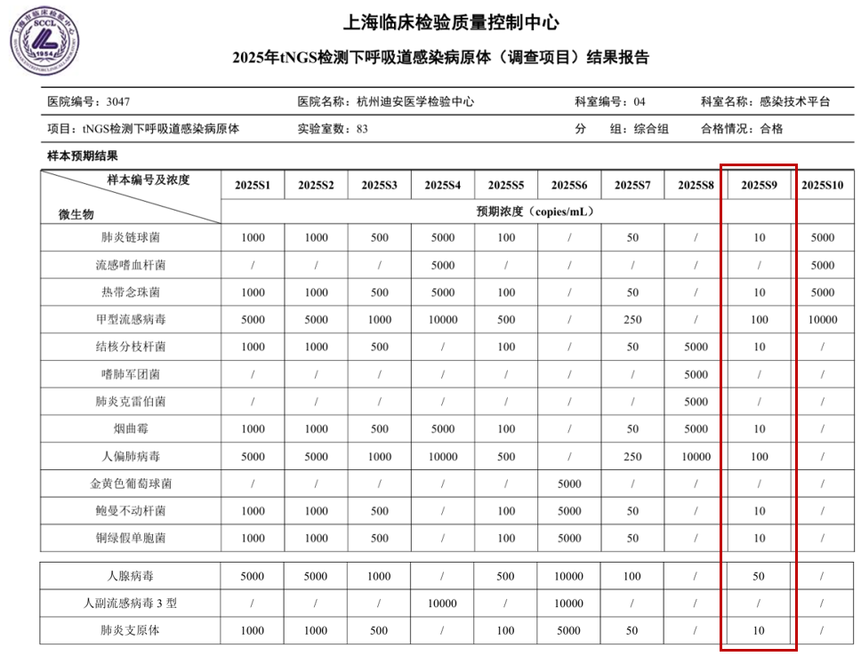 近日,上海临床检验质量控制中心公布了《2025年tNGS检测下呼吸道感染病原体(调查项目)结果报告》,杭州迪安医学检验中心表现优异,高分通过考核。这是上海临床检验质量控制中心首次联合全国医疗机构临床实验室,开展针对tNGS检测下呼吸道感染病原体的专项室间质评。