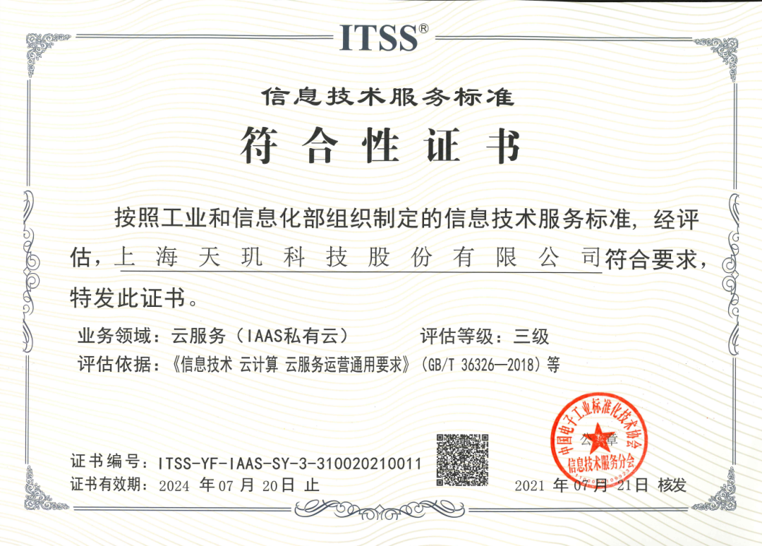 2021年7月14日,中国电子工业标准化技术协会信息技术服务分会(以下称ITSS分会)对外正式公布了最新一批通过云计算服务符合性评估的企业名单。天玑科技凭借雄厚的技术实力和优质的服务能力,顺利通过云计算能力符合性评估,获得IAAS私有云服务三级认证。