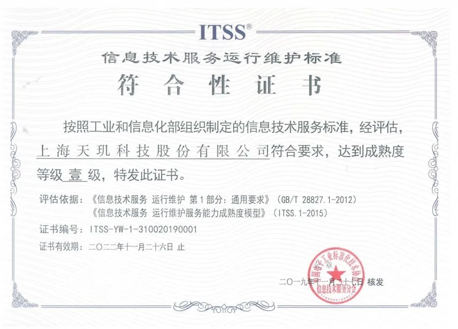 作为中国信息技术服务的践行者,天玑科技早在2011年开始参与ITSS国标的制定,作为ITSS通用要求国家标准(国标号:GB/T 28827.1-2012)、分类与代码国家标准(国标号:GB/T 29264-2012)起草单位之一,天玑科技将自身多年的运维经验总结输出,自身发展的同时也将经验广播。2013年10月,天玑科技成为国内第二批 ITSS 符合性评估获证企业。如今,天玑科技已经连续多年达到信息技术服务运行维护标准成熟度壹级标准。