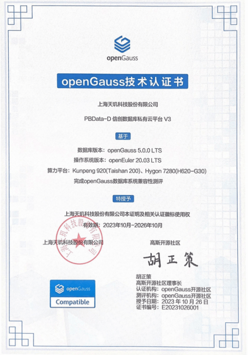 2023年10月26日,天玑科技PBData-D信创数据库私有云平台顺利完成华为OpenGauss数据库系统兼容性测评,并取得OpenGauss 技术认证书。