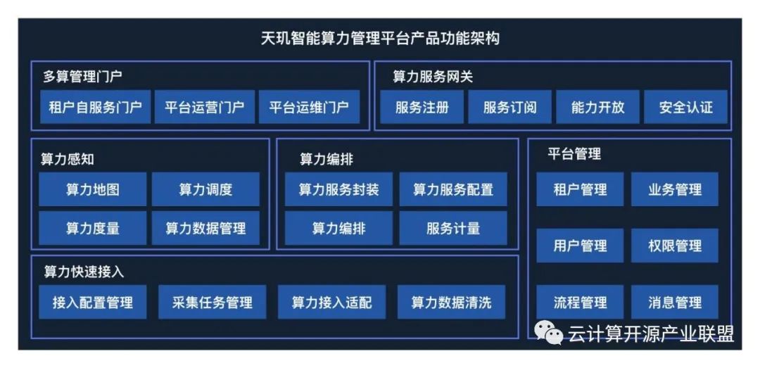 天玑智能算力管理平台是天玑科技研发的纳管泛在、多样算力,推动算力在逻辑空间融合,实现算力域内管理及调度的一站式平台。一方面打造算力接入适配纳管底层各类算力基础设施,实现技术栈差异屏蔽,封装形成统一算力原子能力;另一方构建算力感知和算力编排能力,实现算力的一站式开通调度,满足算力资源敏捷、弹性的一体供给,其核心能力如下: