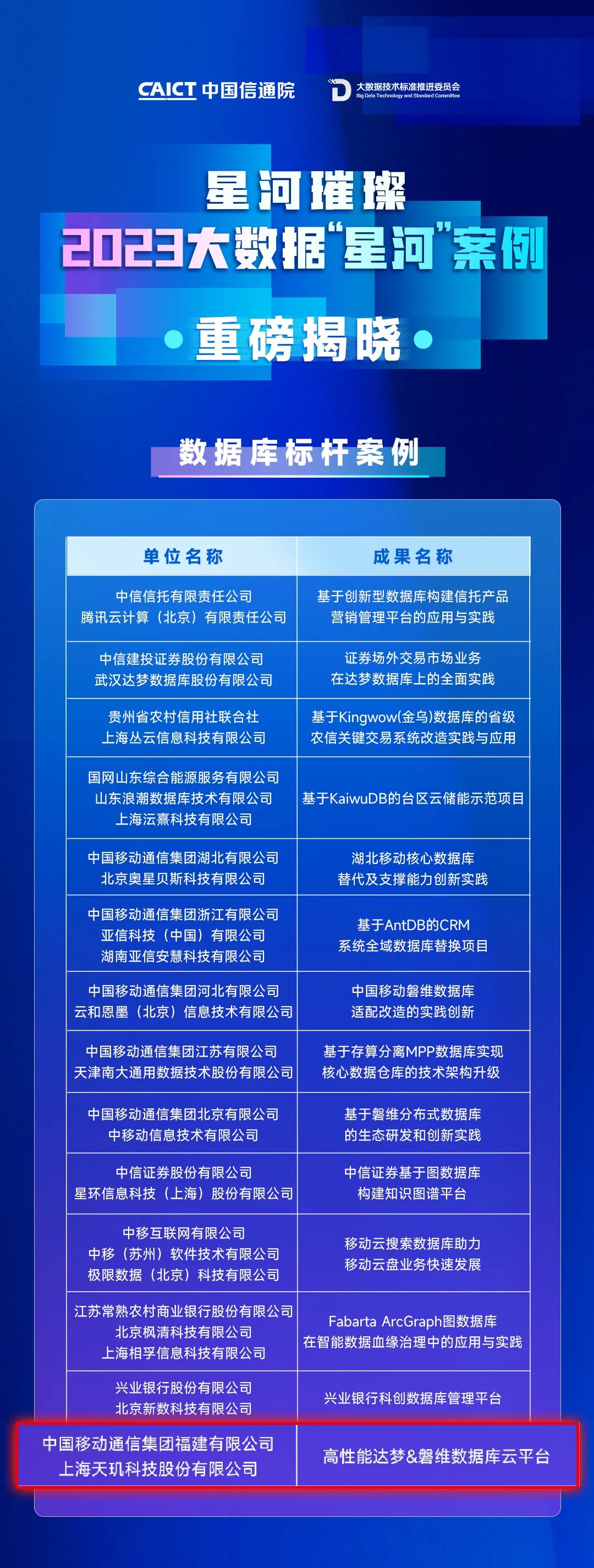 此次第七届大数据“星河(Galaxy)”案例征集包括行业数据应用、数据安全、数据要素流通、数据资产管理、数据库、以及数据向善六大方向,汇集电信、金融、政务、能源、制造等行业共计706份申报项目。其中入选数据库标杆案例有14个,优秀案例26个。天玑科技与中国移动通信集团福建有限公司共同合作的高性能达梦磐维数据库云平台案例荣选为标杆案例。