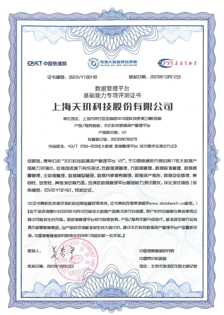 近日,由中国信通院、中国通信标准化协会联合主办的2023数据资产管理大会在京成功举办。大会以“回归数据本质应用驱动治理”为主题,通过“1+6”论坛形式汇聚各类专家,分享业界实践,发布多项重磅成果。天玑科技研发的数据资产管理平台通过了中国信通院开展的第17批大数据产品能力评测,并成功入选《数据治理产业图谱2.0》。