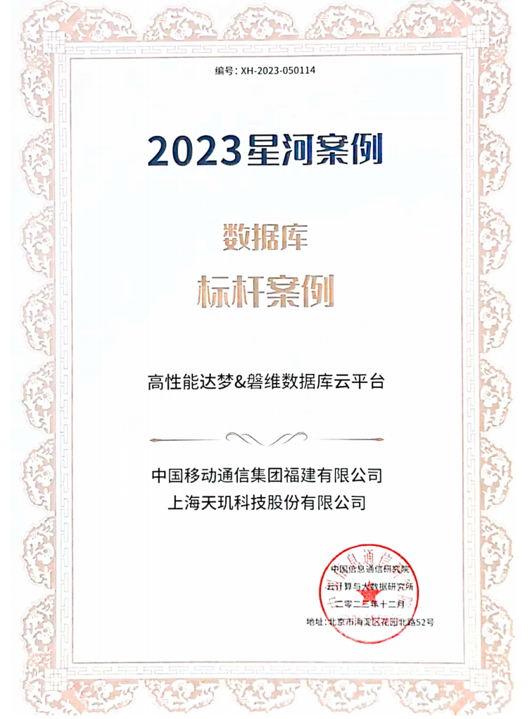 会议主论坛同期颁发了2023年大数据“星河(Galaxy)”案例标杆案例证书。本届案例征集包括行业数据应用、数据安全、数据要素流通、数据资产管理、数据库、以及数据向善六大方向。经过对全部超700份申报项目的形式审查和专家评审,最终共有80个标杆案例脱颖而出。天玑科技“高性能达梦磐维数据库云平台”荣评数据库标杆案例。