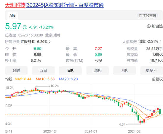 2月28日,天玑科技开盘后一度上涨逾4.5%,此后持续下跌。截至收盘跌幅达13.23%,市值18.7亿元。