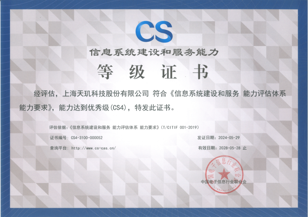 天玑科技在软件和信息技术产业领域具备丰富的信息系统集成经验及成功案例,于2020年获得了全国首批信息系统建设和服务能力CS4(优秀级)认证。近年来,天玑科技持续致力于信息化发展和国产化自主研发与应用,在本次换证复审工作中全面展现了企业在战略管理、科技研发、基础保障、重大项目典型案例等方面的综合实力,再次保持了信息系统建设和服务CS4级(优秀级)水平,为公司进一步向智能化、数字化方向转型发展提供了有力支撑。