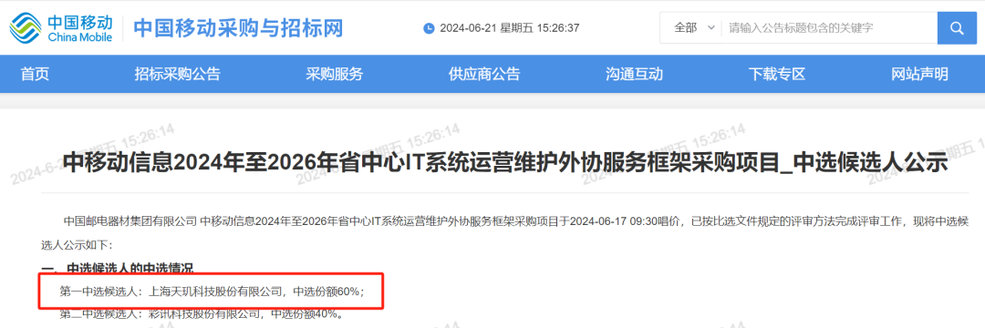 天玑科技作为此次中移动采购项目第一中选候选人,中选份额为60%。项目采购内容包括省中心IT系统监控管理、资源管理、事件处理、业务稽核、日常运营配合、设备维护、机房值守巡检、热线服务等日常基础运营维护服务。服务地点位于中移动信息技术有限公司各地办公区,包括但不限于黑龙江、内蒙古、河北、天津、宁夏、甘肃、新疆、青海、海南等地。