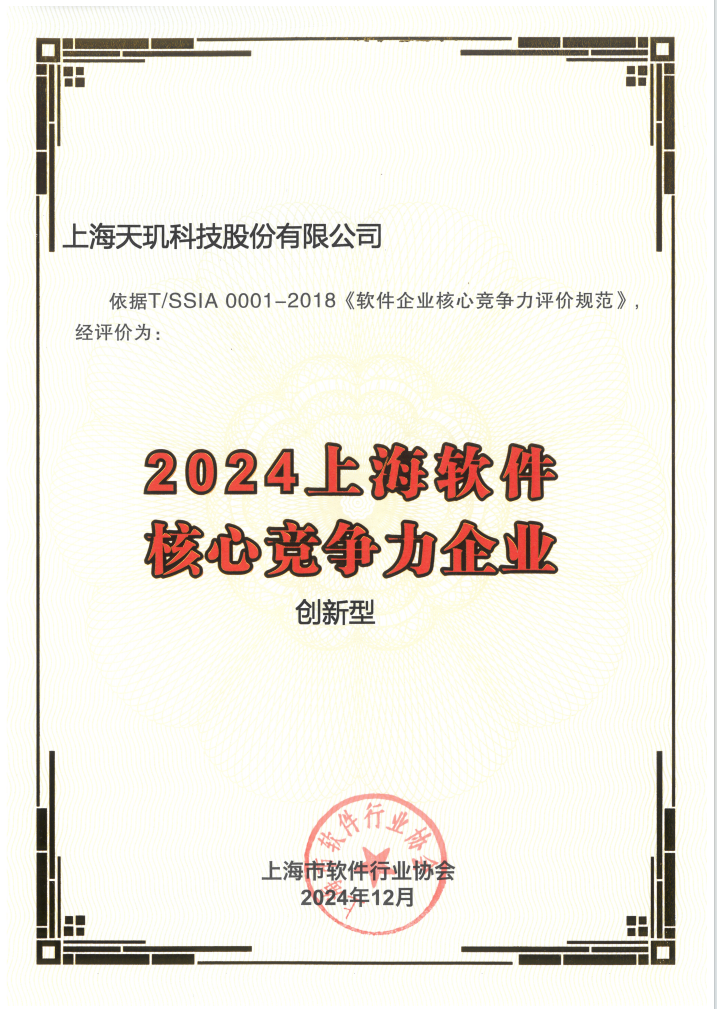 会上,“2024上海核心竞争力软件企业”评价结果公布,天玑科技凭借卓越的技术创新能力和高质量发展态势,被评为“2024上海软件核心竞争力企业(创新型)”