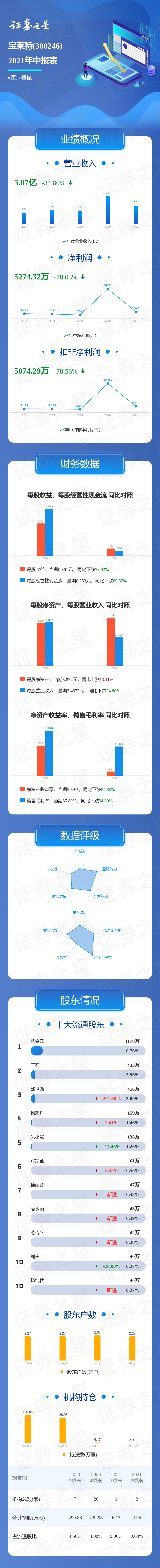 证券之星数据中心讯,宝莱特2021中报显示,公司主营收入5.07亿元,同比下降34.8%;归母净利润5274.32万元,同比下降78.03%;扣非净利润5074.29万元,同比下降78.56%;负债率37.84%,投资收益-19.54万元,财务费用435.21万元,毛利率35.89%。