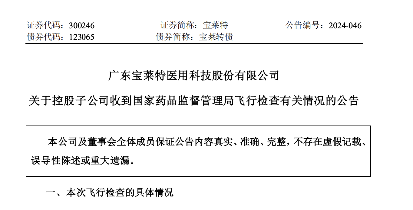 5月28日,宝莱特发布公告表示,收到控股子公司三原富生医疗器械有限公司(以下简称“三原富生”)的通知,国家药品监督管理局于近期对三原富生进行了飞行检查,检查发现三原富生在企业质量管理体系的机构人员方面、厂房与设施方面、生产管理方面、质量控制方面存在严重缺陷,不符合《医疗器械生产质量管理规范》相关规定。