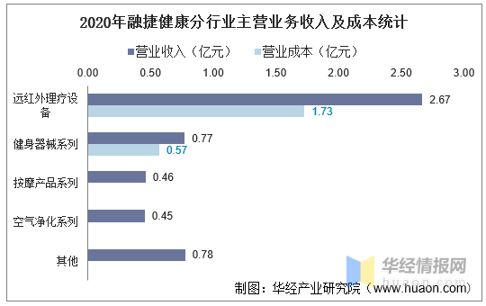 按行业分类来看,2020年融捷健康主营业务总收入为5.14亿元,主营业务总成本为2.30亿元,其中:远红外理疗设备实现营业收入为2.67亿元,营业成本为1.73亿元;健身器械系列实现营业收入0.77亿元,营业成本为0.57亿元;按摩产品系列实现营业收入为0.46亿元;空气净化系列实现营业收入为0.45亿元;其他实现营业收入为0.78亿元;