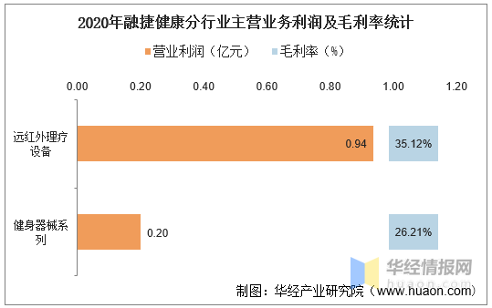 按行业分类来看,2020年融捷健康主营业务总利润为1.14亿元,其中:远红外理疗设备实现营业利润为0.94亿元,毛利率为35.12%;健身器械系列实现营业利润为0.20亿元,毛利率为26.21%;