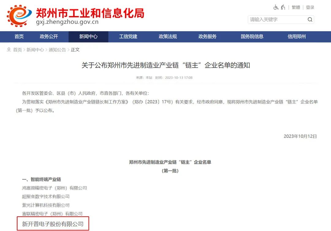近日,郑州市工业和信息化局公布郑州市先进制造业产业链“链主”企业名单(第一批),新开普以其卓越的技术创新能力、稳健的经营策略以及显著的产业领导力位列其中,荣誉上榜智能终端产业链“链主”企业名单。