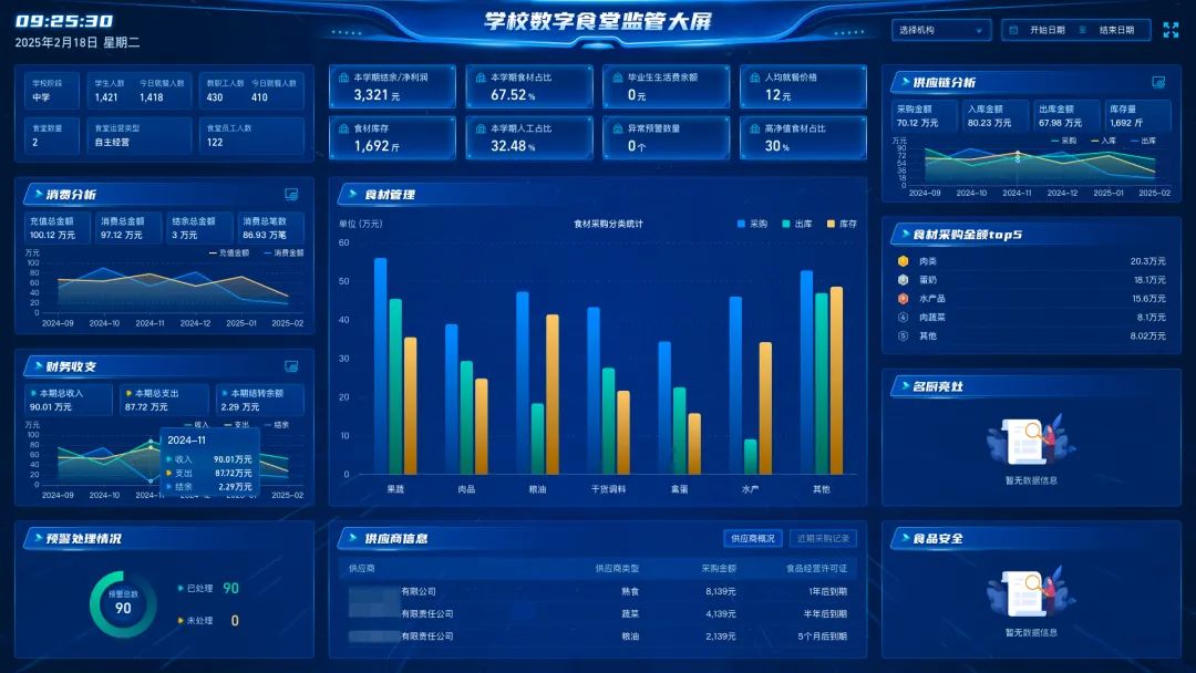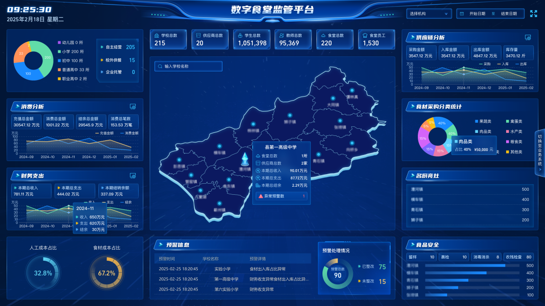 通过数智驾驶舱,教育主管部门能够实时掌控区域内学校食堂的多维运营态势,借助精准追踪消费趋势、动态溯源供应链路径以及智能预警食安风险等功能,构建起“用数据说话、用数据决策”的精准治理模式,推动阳光食堂建设实现全域可视化、决策科学化、管理精细化升级。