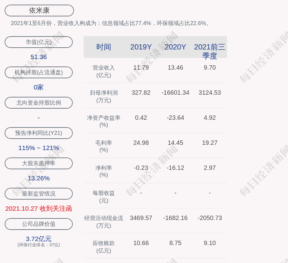 2021年1至6月份,依米康的营业收入构成为:信息领域占比77.4%,环保领域占比22.6%。