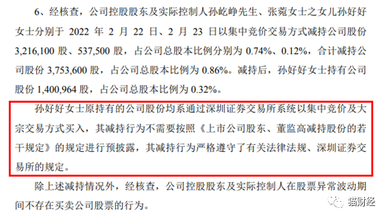 原来根据深交所于2020年6月12日发布的《深圳证券交易所创业板上市公司规范运作指引(2020年修订)》修订说明中提到“不再要求董监高的近亲属、证代及其近亲属等披露股份变动信息”。孙好好作为公司控股股东、实际控制人之一致行动人,未担任公司董监高,故她的股份变动不会在深交所官网上进行公示。